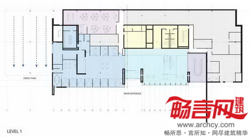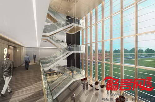 大楼正中将设立“交流中心”,四层的中庭带有的木质楼梯通往公司所有部门,以鼓励不同部门、会员和员工间的沟通交流。建筑的二至四层使用了玻璃和铝金属板,一侧伸出了30英尺,从而为车行道提供了遮蓬。