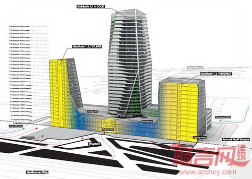 尽管单一用途建筑结构远为普遍,项目试图充分利用被誉为柏林心脏的Alexander广场的文化资源,向合并型居住靠拢。商业、社会和休闲设施通过体育、自然和生活三大概念性主题安排。开发计划方案使居民生活的城市空间具有绿色屋顶景观、瀑布型阳台、庭院和倾斜的绿色广场。