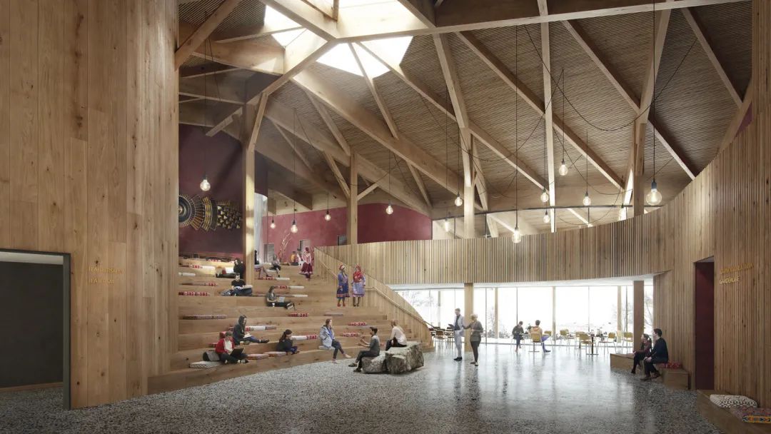 项目设计灵感来自萨米建筑,参考当地传统工艺,达到材料和与自然的和谐。曲线形式和材料有助于将建筑无缝地融入周围的景观。中央前厅为所有用户创造了一个直观的交汇点,为萨米手工艺、烹饪或戏剧等活动创造了空间。弯曲的线条和裸露的木梁营造出诱人的氛围,而受传统建筑启发的天窗则带来了自然光。从前厅开始,该建筑延伸到三个方向,提高了其所容纳的各种功能的视觉识别性,同时也将它们与景观联系起来。