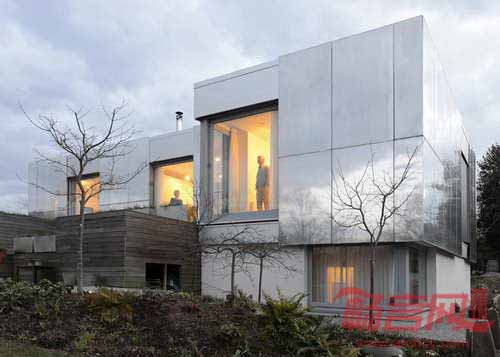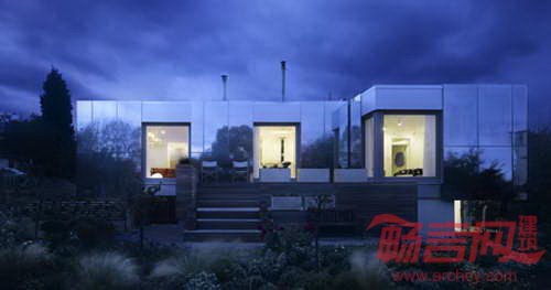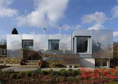 绿色果园房屋位于英格兰西部,项目由伦敦Paul Archer公司设计,具有覆盖窗户、滑过立面的镜面金属结构。房屋四周是花园环境,旨在创建具有伪装效果的建筑,设计师将大块光面铝板添加在墙面上。设计师认为,外层反射板会采集景观中的色彩,使得建筑结构几乎与环境合二为一。