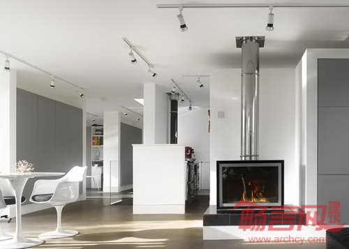 铝板隔热良好,并和机动系统连接,业主将房屋变成一个绝热保温的立方体。房屋共有二层,一层下沉到倾斜的环境中。起居室、餐厅和厨房占据了一层L型空间,通向分别位于西南和东北侧的露台,两侧露台可以捕捉一天不同时段的阳光。
