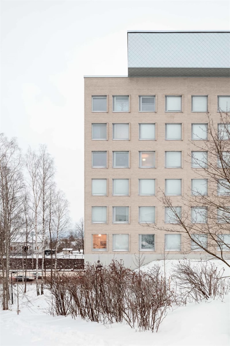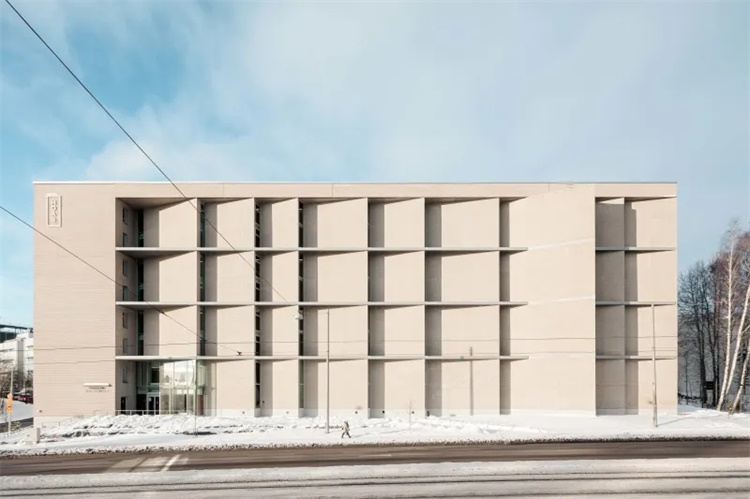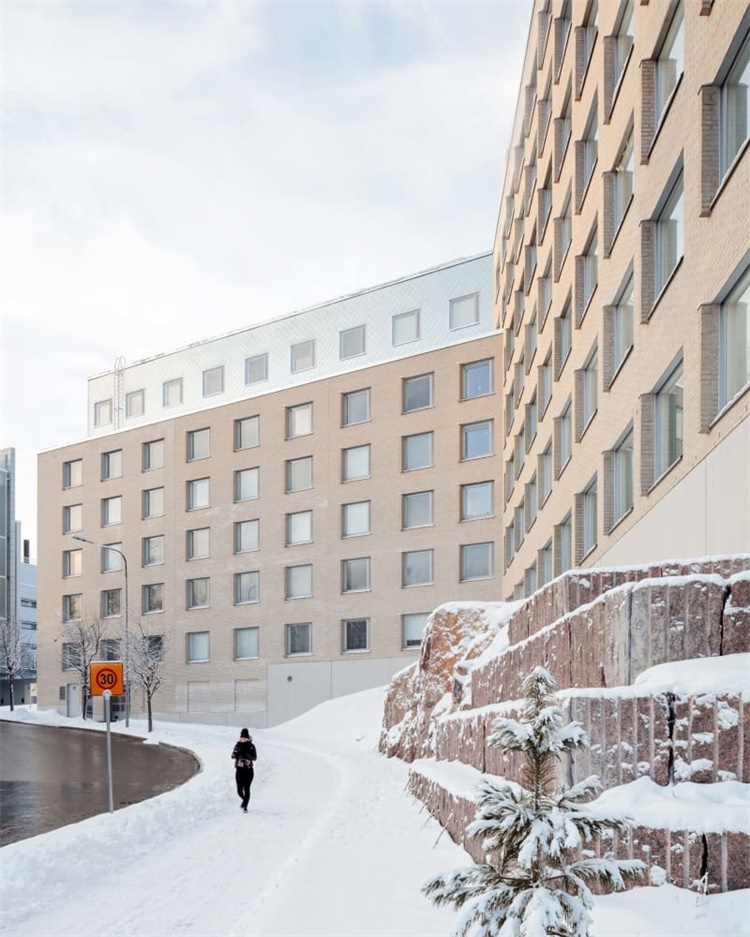 这是赫尔辛基大学Kumpula校区扩建项目。项目由PLAYA ARCHITECTS建筑事务所设计,包含公共空间和200间学生宿舍。场地狭小,位于繁忙的交通道路和教学楼之间的坡地上。