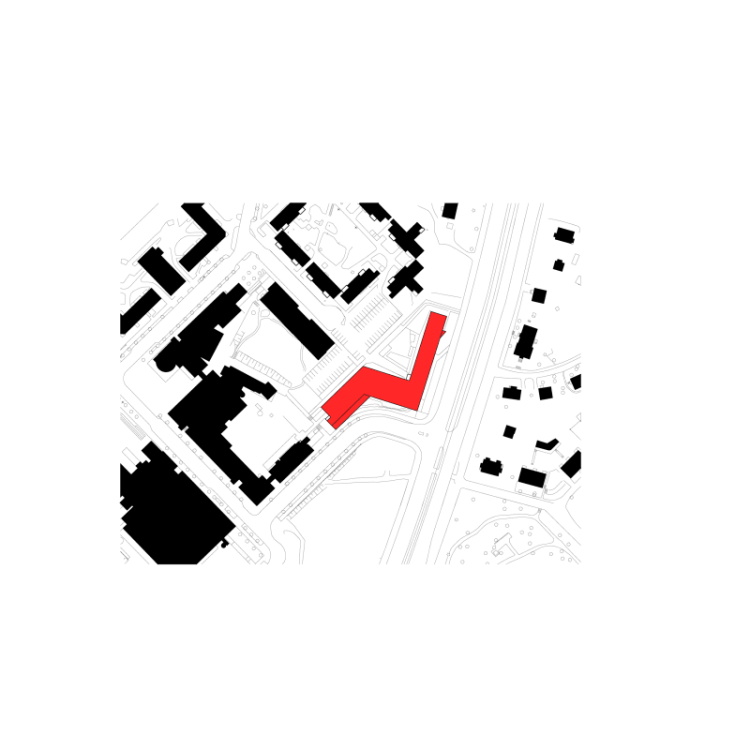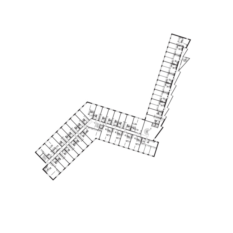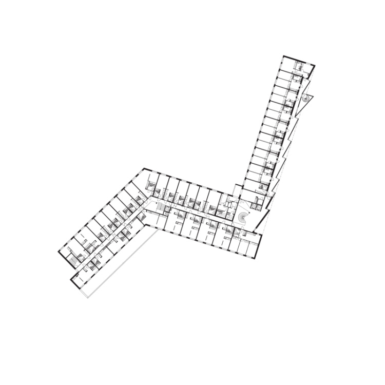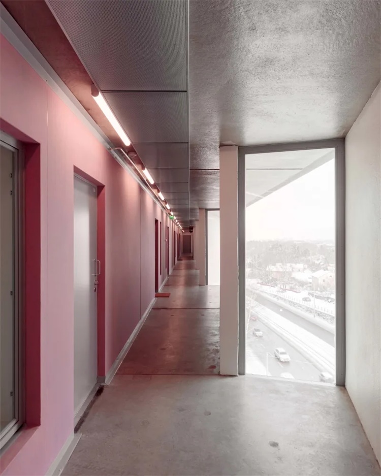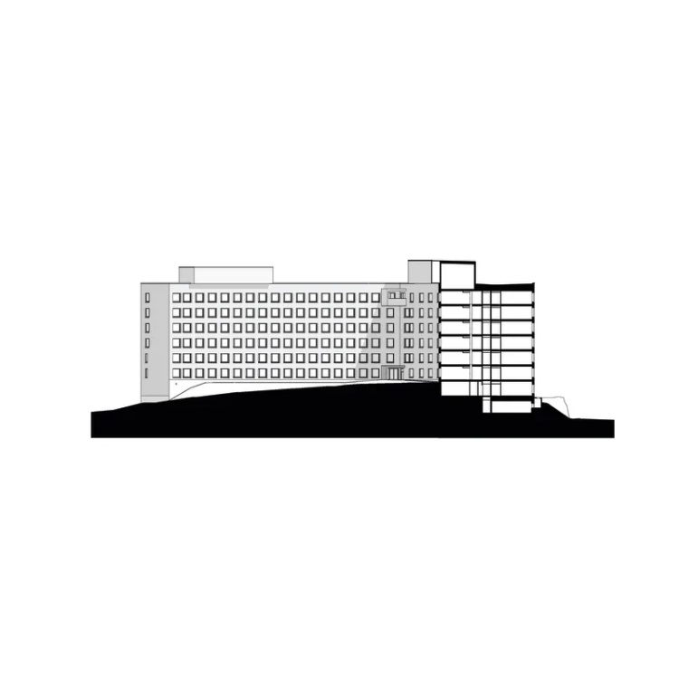 与其他暗淡的砖砌立面不同,较为抽象的北立面帮助新建住宅楼同周边大体量教学建筑建立了互动联系。为了凸显这一目的,其他立面才用了常规的开窗格局。