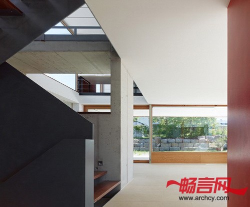 所以,二楼的木瓦外墙和住宅里侧的白色墙壁形成了鲜明的对比,这就让四个空间明显的分开。