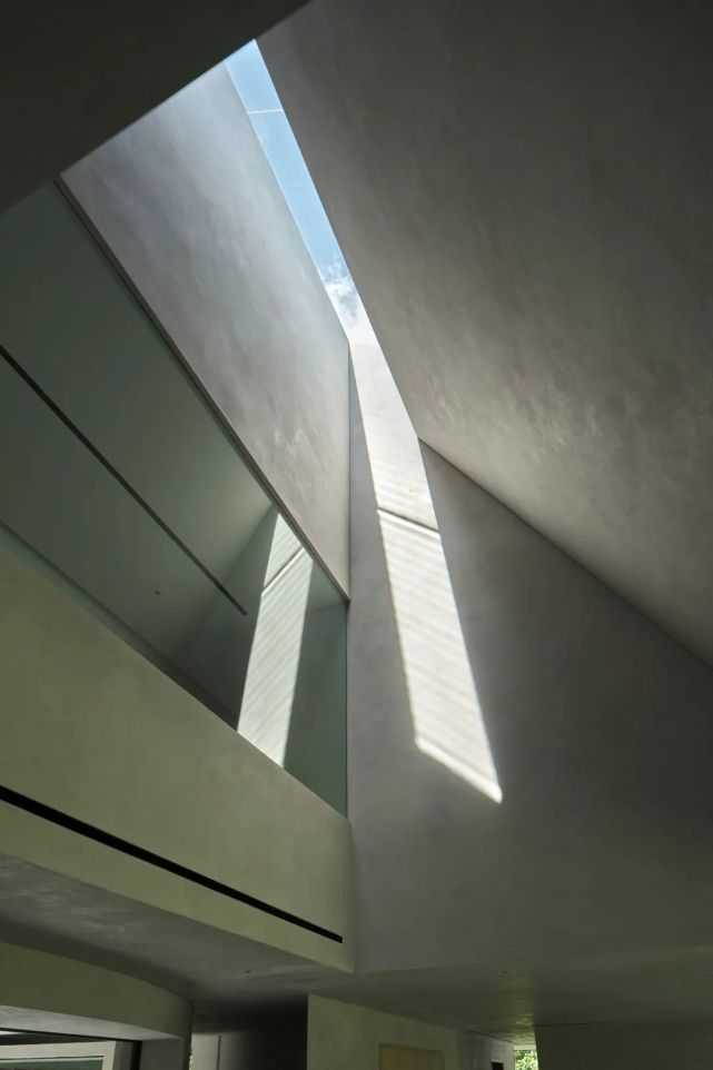 步入纪念花园之前,屋顶上方的一处切空将一棵小树轻轻框入。阳台与天窗井从坡屋顶的立面中雕刻而出,光滑的屋顶外部过渡到内部木板纹理的混凝土。