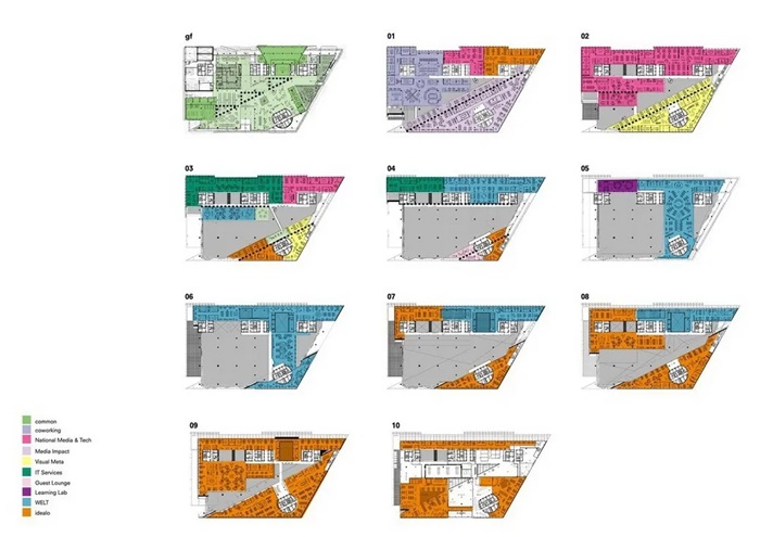 新大楼采用了对角线平分的中庭设计,其中庭沿着对角线将建筑一分为二,并通向Axel Springer总部。每层楼由有顶的正式办公空间和裸露在外的平台组成。建筑师将山谷沿着建筑一半处镜像,创造出立体的树冠空间。