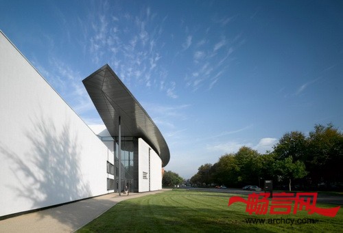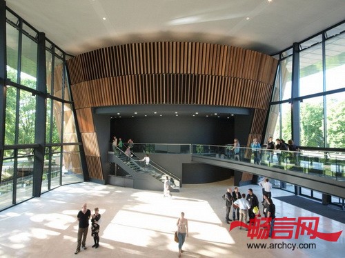 该建筑是由外向内设计的,每个表演区域都是单独的建筑。戏剧楼有一个新幕墙,排练大厅深入到了已建楼房附近的林中。这几座楼由一个简单的飘浮屋顶连接在一起。学院的新入口朝向美丽的Bute公园展开,骑楼是整个学院的脊梁,它不仅将学院的各个功能区域连接起来,也是设计和服装学院的展区,同时,它还是音乐学院的“肺”,因为它是公共区域的通风口。