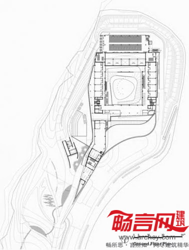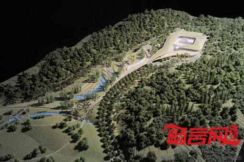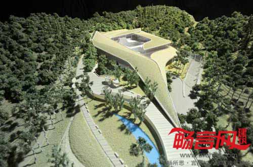 为了克服公众的消极反映,陵园设计师试图避免“矗立”的建筑形式。相反,公园呈现出所谓的“场景艺术”,一系列流畅的建筑形式和主题融入了现有的地形环境。公园正中的凹陷处有一个庭院,周围是进行祭奠仪式的空间,与之相隔数米的地方是山脊和轨道。倚靠庭院而建的两层火葬场建筑的屋顶造型灵感来自花瓣的排布方式,建筑和庭院之间有一个水池。