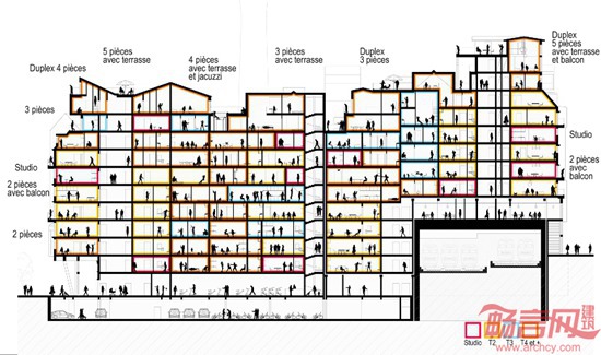 巴黎Reinventer竞赛由巴黎市长Anne Hidalgo和主管城市规划的副市长Jean Louis Missika发起,旨在寻找富有创新性的城市项目。Marin + Trottin工作室在23个候选场地中挑中了位于十三区的一个,设计了一个极富原创性的住宅项目,目的是让住户同城市联合起来,参与并分享城市建造过程。项目包含若干种不同的住宅弧形,共同点是均符合巴黎人民的期望和需求。
