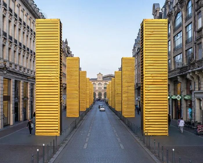 西班牙城市艺术家 SpY 的最新公共艺术装置《黄金巨石阵》(Golden Monoliths)在法国里尔市中心惊艳亮相。14 个经过镀金处理的集装箱被垂直竖立,沿城市主干道庄严排列,将这条日常通道转变为充满仪式感的艺术长廊。这些闪耀着金属光泽的工业构件彻底摆脱了原有的实用功能,蜕变为极具视觉冲击力的城市图腾。
