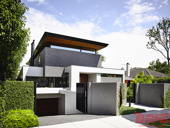 Bungalow Court位于澳大利亚布莱顿市郊外一处枝繁叶茂的小巷尽头,从远处望去,首先映入眼帘的是这座房子风筝形状的屋顶。屋顶仿佛没有支撑一样悬在空中,仅有下方狭窄的水平玻璃立面将其与房子连接起来。