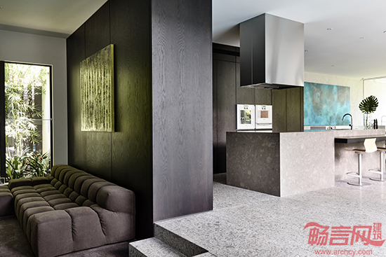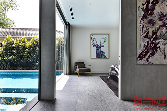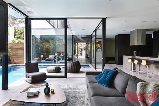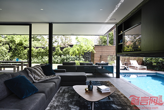 采用这种别出心裁的设计,建筑师意在营造一种放松而又精致的氛围。进入房子,顺着通道往里走,内部结构逐渐明朗,室内外起居空间相互贯通。