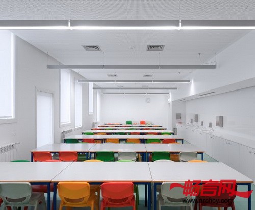 室内的特色就是各种元素的重复使用,例如乙烯基过道、悬挂灯、白色喷漆的MDF一处和们,这保证了室内的明亮和整洁,同时,这些材料和布置还保证了孩子们可以在这里可以很好的交流。