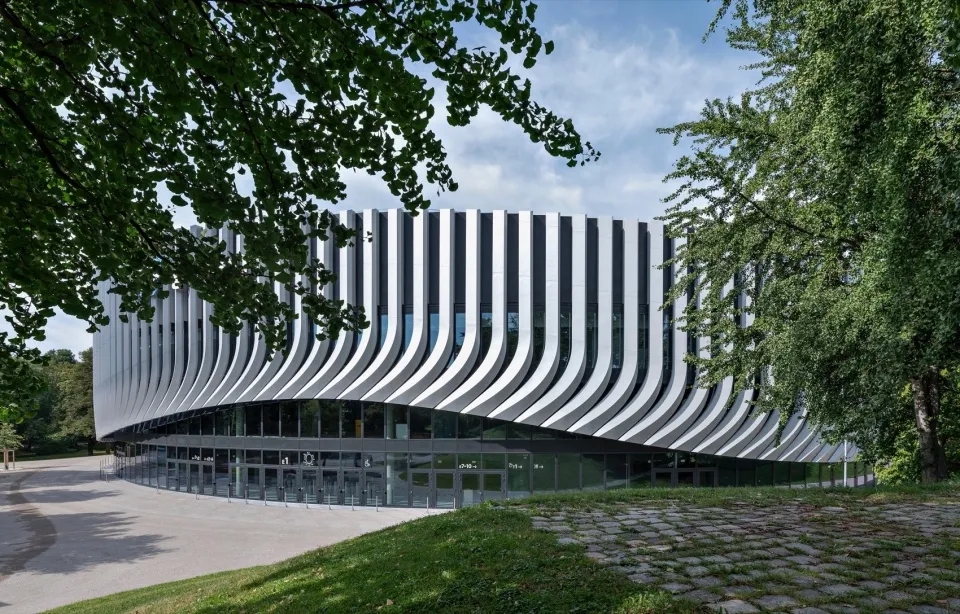 全新的SAP花园体育馆建在前奥林匹克赛车场的旧址上,与由Frei Otto和Günther Behnisch设计的标志性奥林匹克体育场相邻,得天独厚位置和周围的环境为本项目赋予了深厚的背景文脉。体育馆面积达62500平方米,由3XN与CL MAP和景观建筑事务所Latz + Partner合作设计。该体育馆将是慕尼黑红牛冰球队EHC和拜仁慕尼黑篮球队的新主场,此外,场馆内还设有三个溜冰场作为训练和公共设施。场馆可以在冰球比赛期间容纳10700名观众,篮球比赛期间可容纳11500名观众。除了体育设施,体育馆还提供了三层VIP区、商品商店、大型餐厅、游戏室、办公室和会议室、停车场和公共屋顶露台。