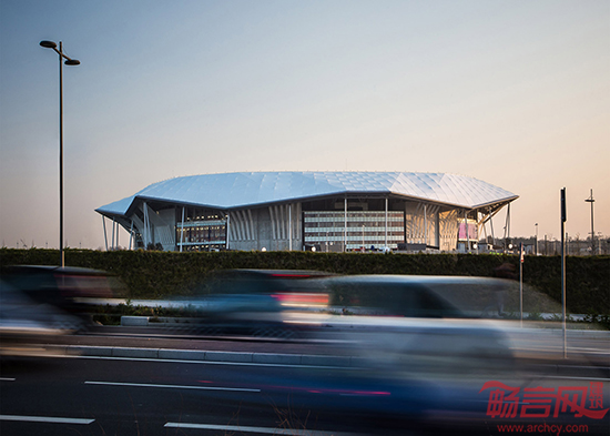 从远处看,这座体育场结构像一只海龟,因为顶棚比较大。53700平方米的顶棚像一个龟壳一样盖住了体育场。