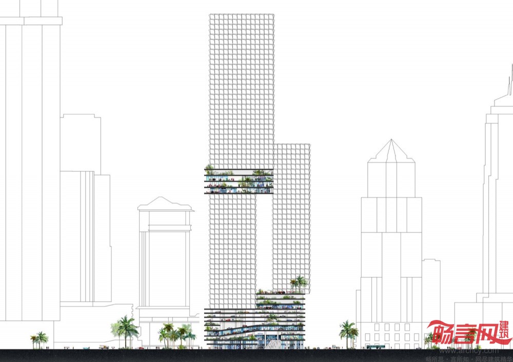 在3个“悬浮”楼体交汇的位置,是另一个由水平混凝土板构成的模块,称为Sky Level。这里离地面已经120米,种植了也很多绿色植物,这里有餐厅、宴会厅和商务会议区,还有一个大水池,为人们提供了很好的社交休闲场所。这个模块的上方,即大楼的37-64层,是高端住宅区,共有280个单元房,1-3居室的户型都有,还有复式结构和阁楼。