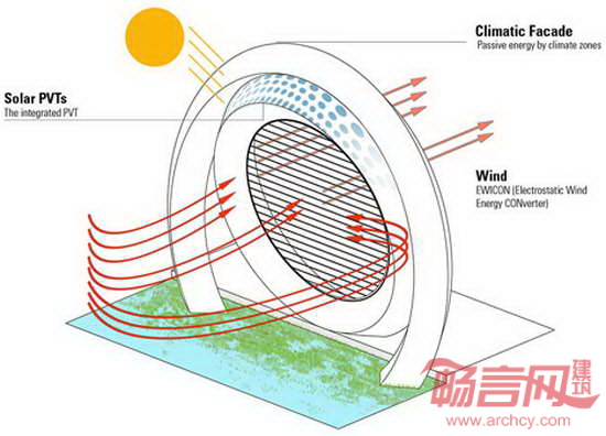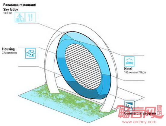 DoepelStrijkers工作室同Meyster公司以及BLOC公司合作,共同完成了荷兰鹿特丹巨型风机住宅综合项目。建筑由两个巨大的环形风机构成,涵盖了公寓单元和酒店,同时包含一个过山车设施。项目被称作“世界上最具创新性的风机”,荷兰风轮项目旨在成为鹿特丹河岸一大地标。建筑结构高达174米,两个环形中的外环容纳了40个过山车车厢,静止的内环涵盖公寓、酒店和餐厅设施。
