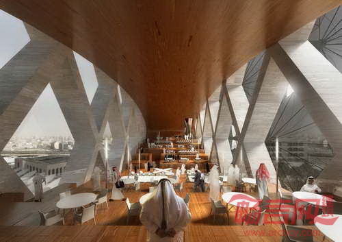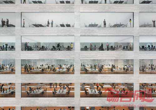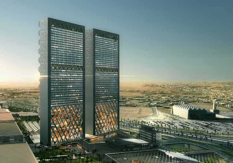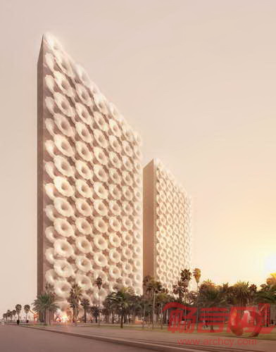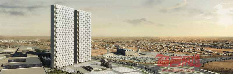 纽约REX建筑事务所设计了两个中东地区传媒公司联合总部大楼。两所兄弟公司设计要求是两座形态优雅、对传统酋长建筑致敬的大楼,同时满足功能性要求。项目从一座纤长的结构入手,其尺寸约为100×22m。设计团队试图在建筑内同时容纳办公、广播和新闻工作室等设施。为了在狭窄的场地上容纳所有设施,建筑呈垂直排布,将大型工作室设置在地下区域。公共区提供广阔的视野和充足的自然光照,位于建筑的低楼层,独特的“X射线”效果展示了内部功能分区。