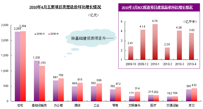 专业工程信息咨询公司RCC的月度项目监控报告显示,在2010年4月RCC所报道的工程项目(除基础建设及公用事业设施以外)建筑面积为3.82亿平方米,项目总造价达到了7014.3亿元。与3月份相比,除基础建设类和医疗类项目造价出现小幅度下降之外,所报道的其它类型项目造价均出现一定的增长,总体形势较为乐观。