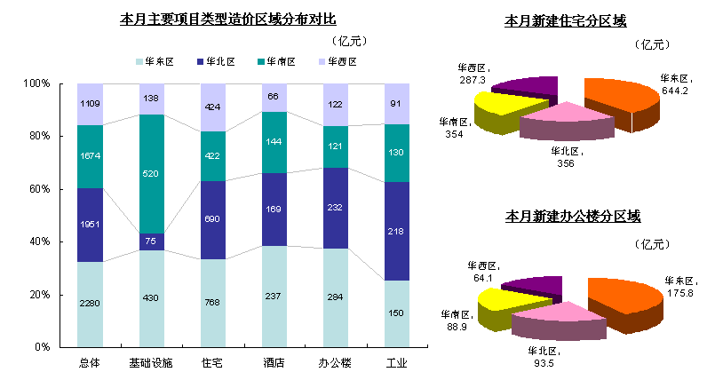 从总体来看,华东区依然是国内工程项目最集中的区域;进入4月份,华北区基础设施类项目明显减少,重心逐渐向工业建筑类项目倾斜;华西地区住宅类项目增长明显,本月在建项目首次超过华南。而对于本月新开工的项目,华东区依然表现抢眼,住宅、办公楼项目造价分别为644.2亿元和175.8亿元,远远超过其他地区。