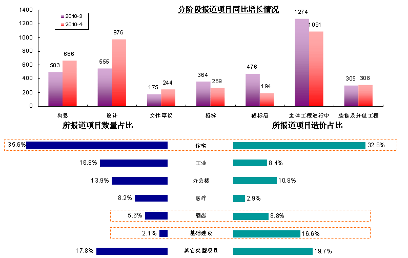 2010年4月,RCC的工程信息监测能力进一步提升,单月项目报道数量达到4,435条,其中新增项目信息1,936条。所报道的基础建设和公共事业设施项目的总造价较去年同期下降明显,而除去基础建设和公共事业设施外的项目总造价则增长幅度较大,达到了42.2%。同时由于国家继续加大外资引进的力度,近期外资参与的项目明显增多,近期同比增长19.1%。