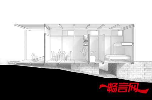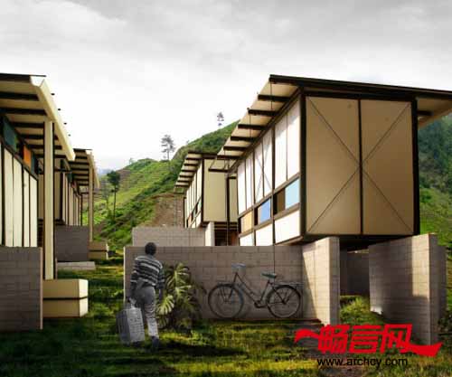这项工程是为海地灾后重建区域而专门设计的模块式的房屋,它致力于建造一个能够自给自足的住宅小区,并使每个房屋的面积最小化。建筑师计划将这个住宅工程分为四个8 x 8英尺的模块,每一个模块则是一个房屋。设有浴室和厨房的中心区域将室内分为一个卧室和餐厅起居室。第四个模块是一个室外门廊,人们可以在这个区域里进行灵活的功能转换 --- 可以将它建造成各种活动区域,这样就为小区提供了一个多功能的公共场所。由门廊形成的L形区域不只使住宅小区内的各个房屋风格一致,也为每个房屋提供了一个私人花园。
