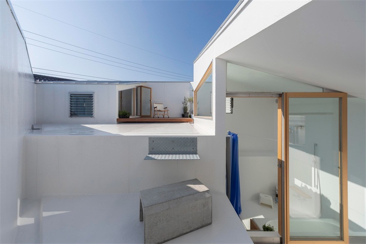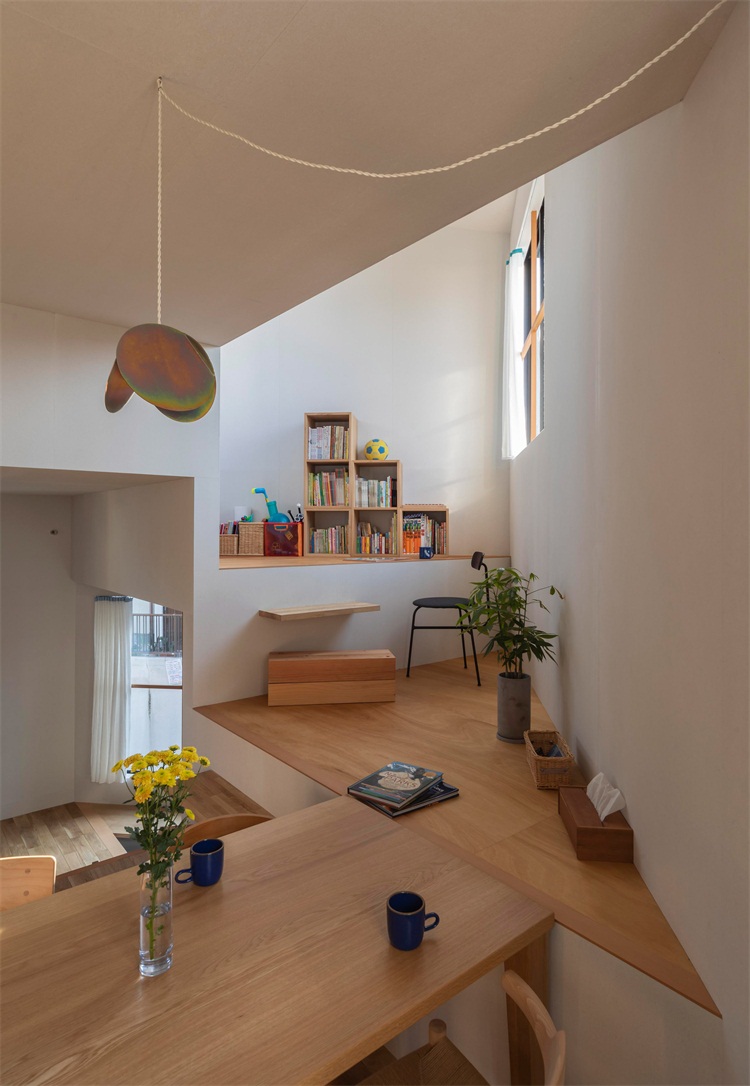 与常见的楼梯不同,住户走过木块、架子和其他家具,在不同的楼层之间移动。建筑师说:“与其用墙壁和不同楼层来清晰地将空间划分成各种功能,不如通过阶梯式楼层,让一切松散地相互连接和断开。这个想法是在小房子里创造一种扩张的感觉,这样你会发现自己一会儿在屋顶上,一会儿藏在地板下面”。