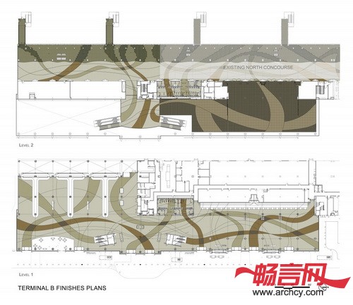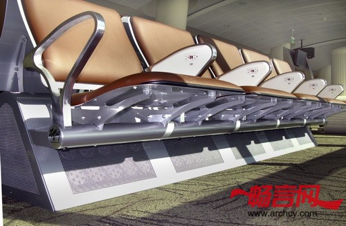 这里的另一项高科技设计便是由Fentress建筑事务所、机场人员和Zoeftig公司共同开发的“空调座椅”。这个新座椅可以为旅客的电器充电,而且对航站楼也有节能环保作用。在座位的底部还有风口,这就是说椅子也可以作为空调。所以“空调座椅”不只是一个节能的通风系统,它还是航站楼B 的一个高效通风系统。