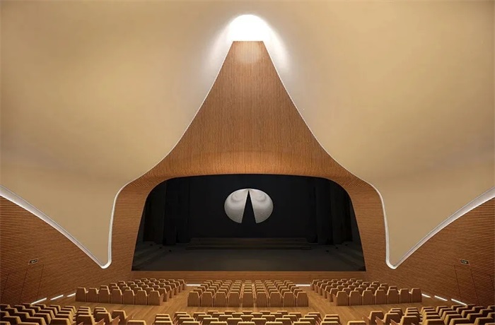 与此同时,剧院的主要特征是其戏剧性的,喇叭形的天花板靠近上方的椭圆形照明孔。剧院设有一个灵活的座位配置,可以容纳400到700人,并允许多种类型的表演、合唱和交响乐排演空间,大型接待大厅位于乐团大厅上方。