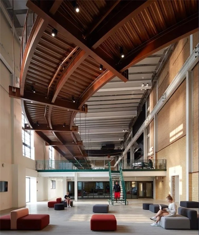 该项目位于Rock河沿岸,靠近贝洛伊特市中心,将历史建筑和新建筑巧妙的结合在一起,设计保留了原有建筑的特色和工业感,同时又融入了新的可持续实践和活跃的交流空间,鼓励学生之间相互交往。