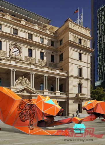 悉尼海关大楼即将成为两只“老虎”的家。这对老虎由具有创新意识的LAVA(Laboratory for Visionary Architecture)建筑事务所设计,用以装饰澳大利亚的中国新年庆典——2010年是中国的虎年。LAVA求实的处理方法呈现了让人惊奇的、栩栩如生的复杂形象,这就是几何折叠法,被称为“origami”,翻译成中文就是“折纸”。