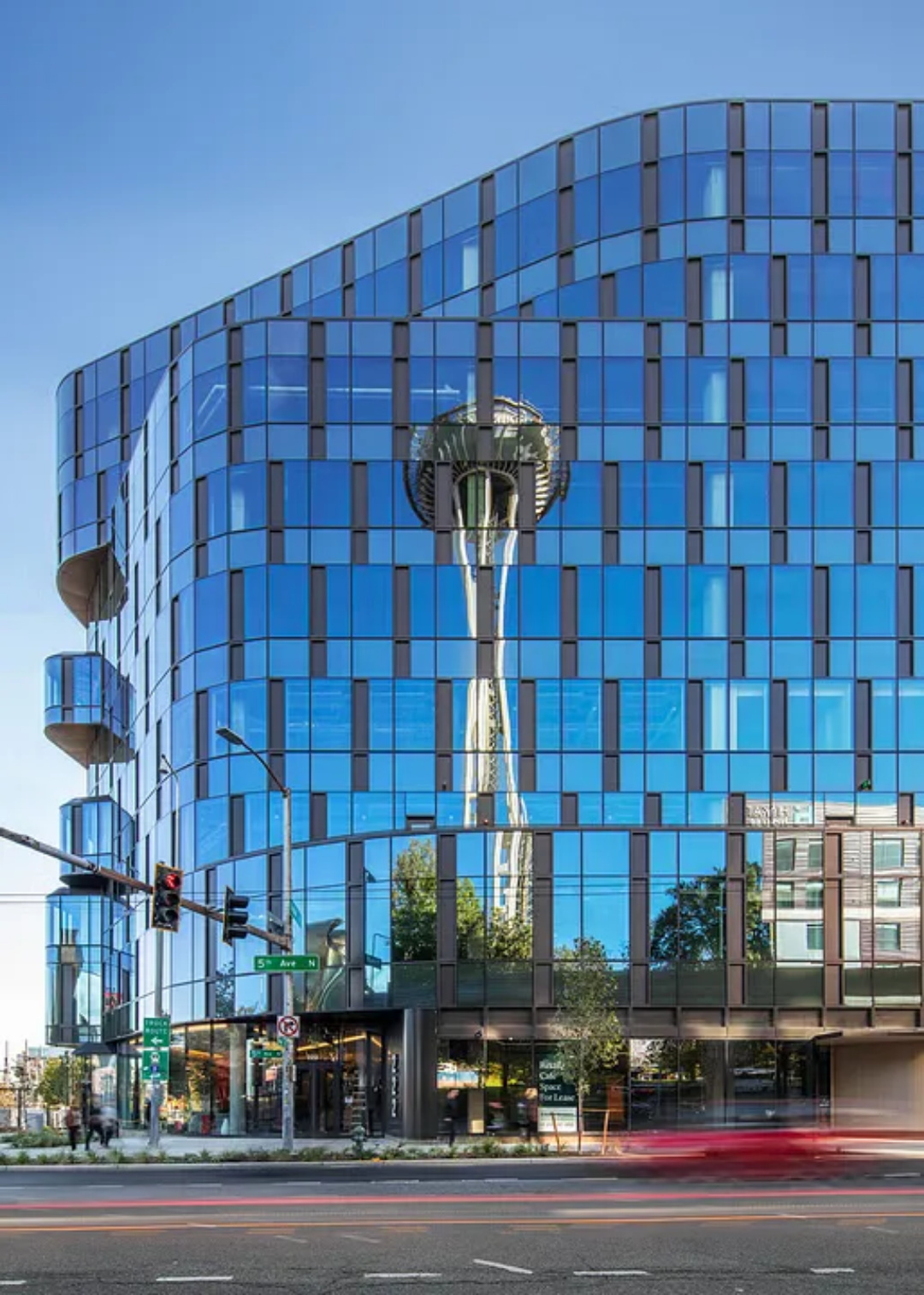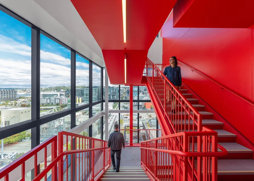 建筑的体量与布局“呼应了美国流行文化博物馆(MoPOP)的雕塑感形态”,立面的弧线设计与下方滑板公园的设计相得益彰,同时展现了行人与骑行者流向西雅图中心区域的动态流线感。建筑内部一座蜿蜒的特色楼梯作为主要的交通动线,从托马斯街角延伸,成为员工的“灯塔”式引导标志。此外,多个屋顶露台为员工提供了互动交流的空间,激发创意与灵感。