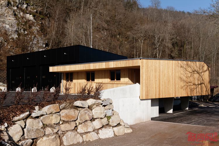 消防员在技术中心工作。建筑的第二个区域隐藏在行政区后面。其黑色外形不仅凸显了木质外立面的典雅,同时让大体量建筑在周边山地环境中脱颖而出。