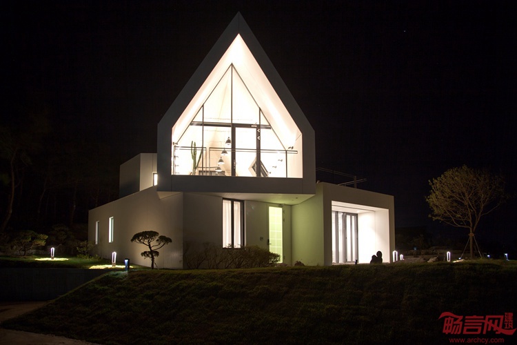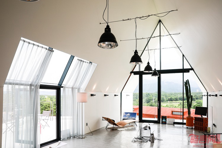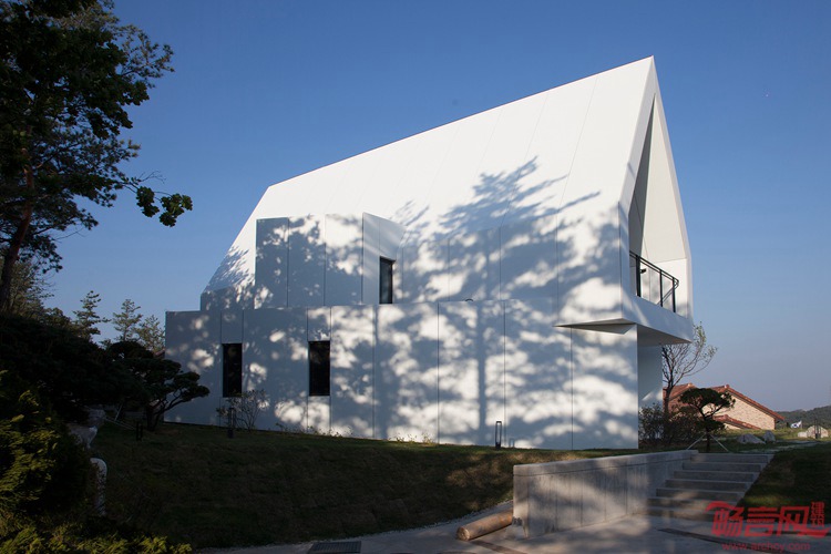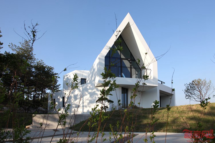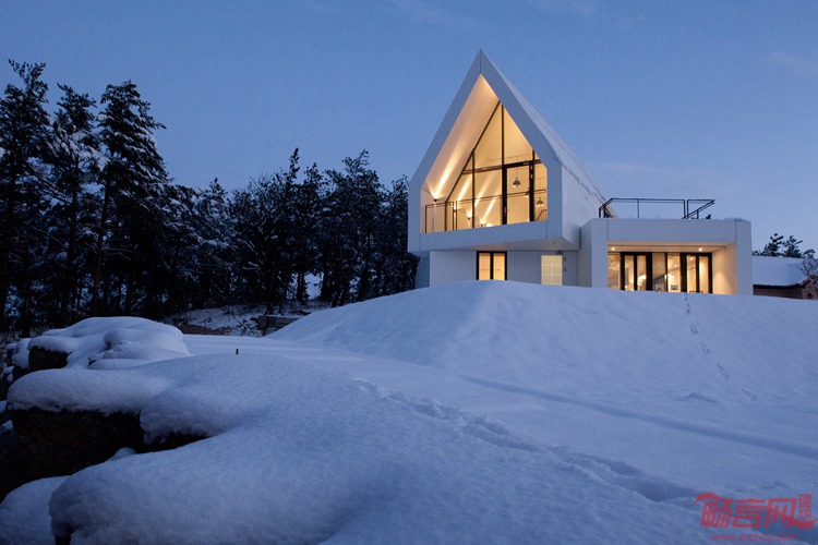 AEV事务所设计了韩国“至简纯白”住宅工作室。项目位于Sokcho,私人住宅拥有简单的轮廓,同周边的Seorak山的葱茏形态构成对照。在现代艺术和建筑中,白色被赋予了多层面的意义。许多场合中,白色同时也是纯净、抽象、简约和清晰的象征。白色色度也在许多非再现艺术中被反复检验,1920年代,白色这一色彩也成为建筑学新时期的体现。理查德·迈耶可能是在其建筑中坚持采用白色格栅外立面的最著名的建筑师,他至今仍在作品中坚持这一风格。在法国AEV事务所查看了项目场地中的壮观山峰和色彩后,他们采用了事宜的建筑设计手法,构想出简单形状组合。这种去材料化通过使用丙烯酸树脂板实现,突出了自然环境形状和色彩的多样性。白色也占据了室内起居室,使得室外景观能左右房间的氛围。