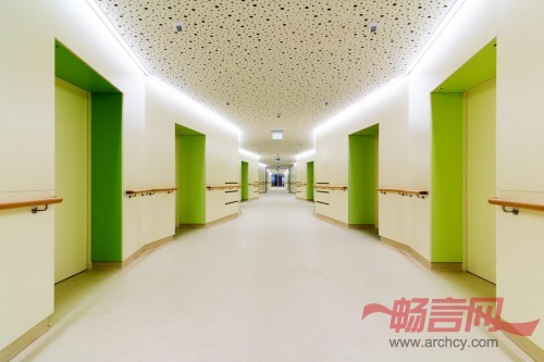 建筑内部的走廊墙壁采用了折线策略。这些折线标记出了每个单间,并形成壁龛。在新老建筑结合处的中央护理病房附近,设有一个朝南的公共休息室。