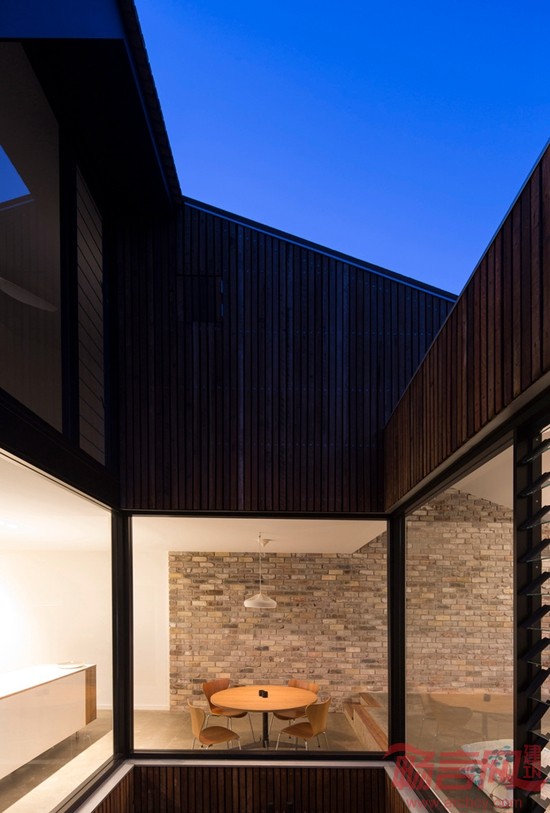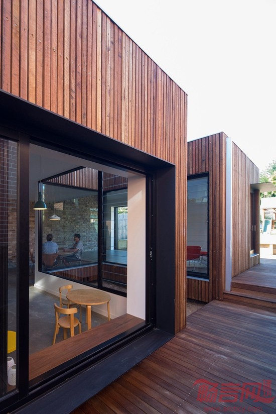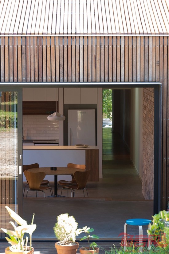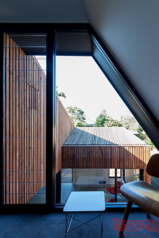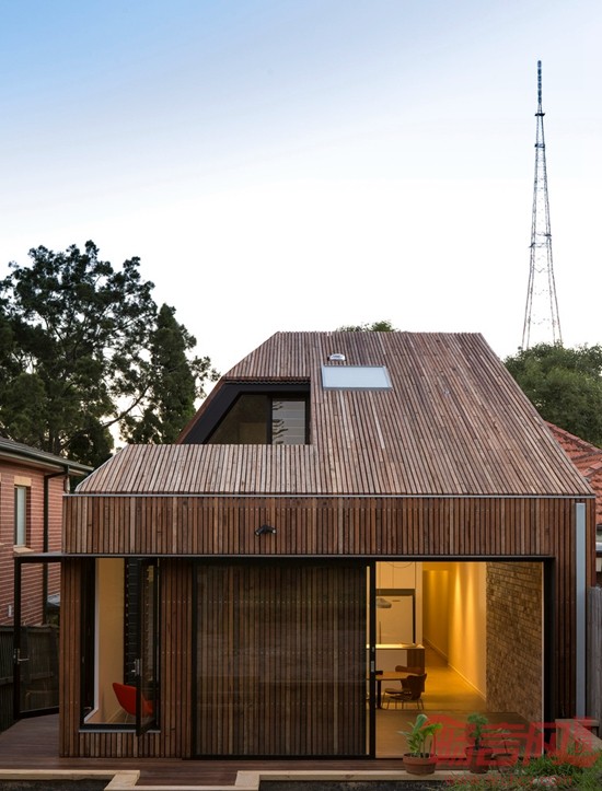 在澳大利亚悉尼市北部沿海地区,有一座建于两战之间年代的半独立式房子,坐落在许多高低起伏的瓦片屋顶和铁皮屋顶房子之间。建筑师事务所Scale Architecture对这座房子进行了扩建,新增了一栋木板包覆的现代二层小楼。