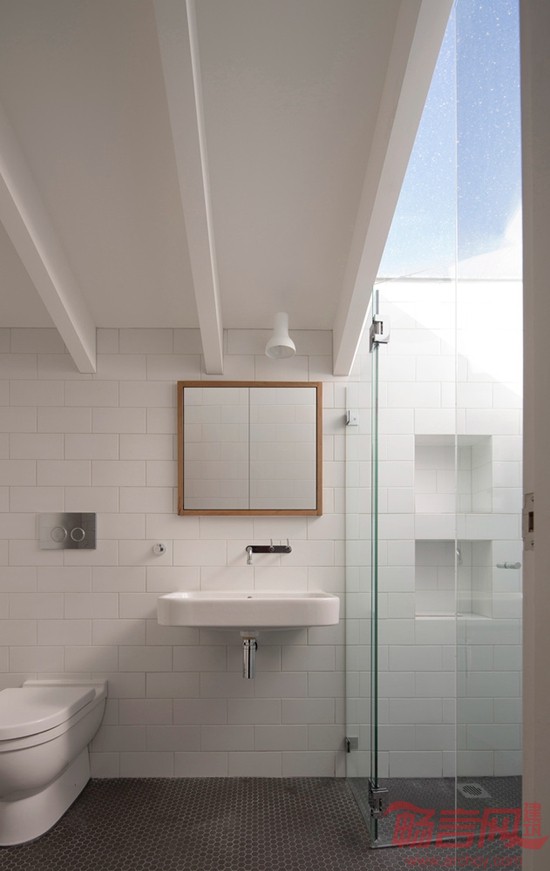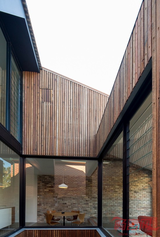 建筑师没有对原有的半独立式房子作任何改动,其后部的新建小楼有一个不寻常的斜屋顶——屋顶的较大一部分被“切掉”了,这样日光能够更深地照进屋子里,整个户型呈“C”字形,中间留下一个天井。