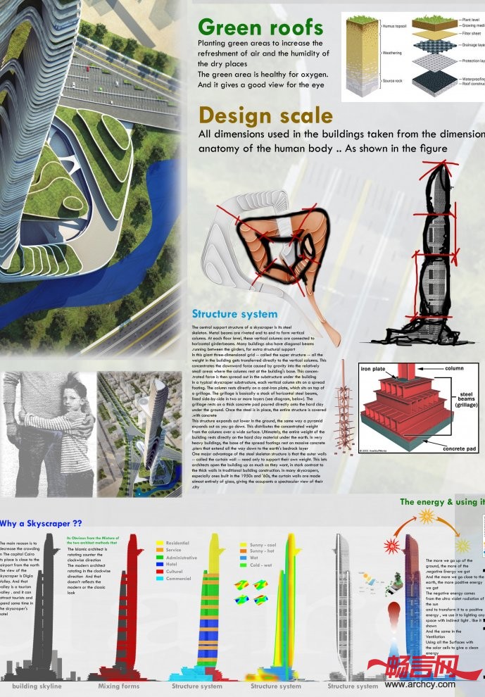 该项目的设计理念由三部分组成:1. 摩天大楼式的外形。摩天大楼的主要外形的设计灵感来源于儿子抱着父亲的腰。地下楼板的外形设计灵感则来源于Wadi Degla的形状,用以建立起建筑与自然的联系。2. 城市设计。摩天大厦高470米,从远处看,它与开罗市的一条增长线相互呼应。3. 设计风格。现代与伊斯兰建筑风格的融合体。伊斯兰建筑要反应当地的风格,现代建筑则反映出时代。