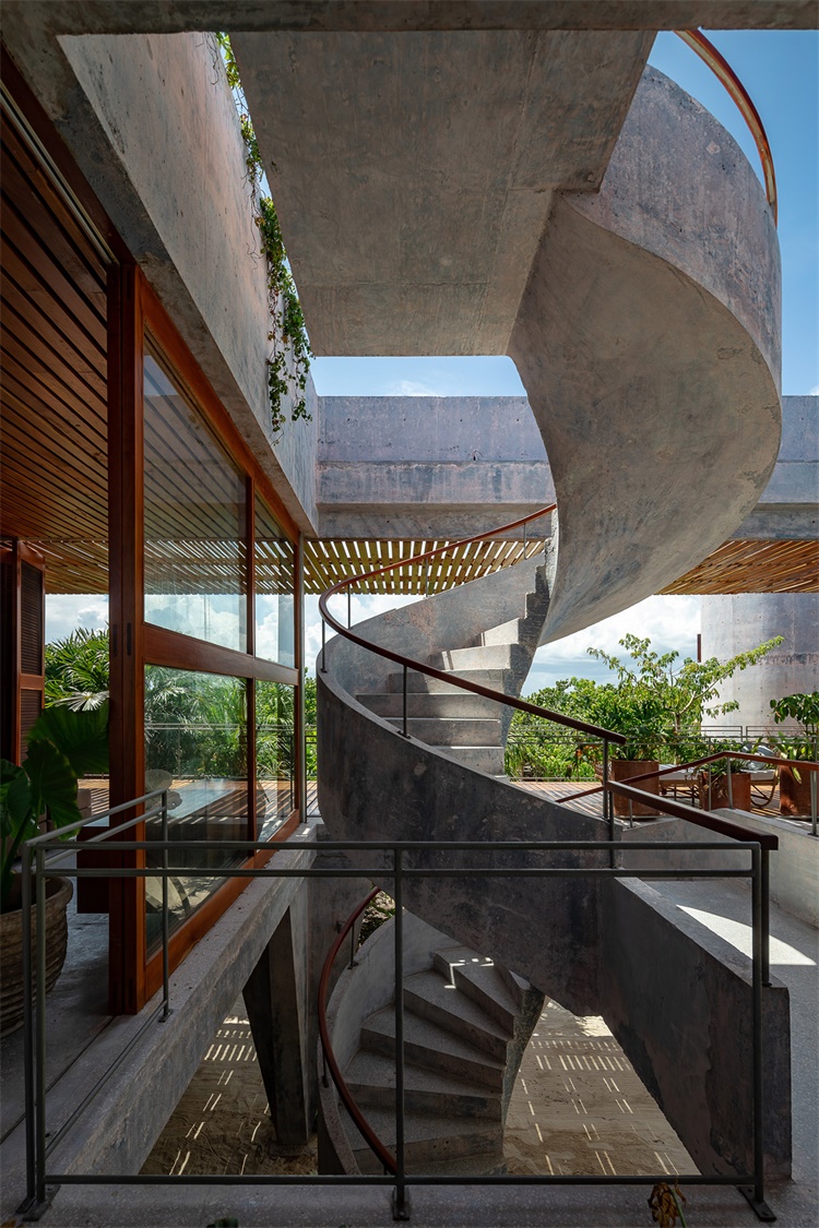Productora建筑工作室设计了墨西哥Yucatan半岛混凝土住宅。项目设有螺旋楼梯、屋顶游泳池和板条门。名为Bautista住宅的两层建筑坐落在Sian Ka'an生物保护区茂密森林中,该区域1987年成为联合国教科文组织(UNESCO)世界遗产。