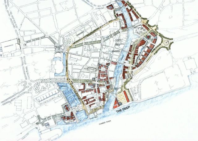 位于东约克郡的赫尔曾是具有悠久工业历史和文化的贸易港口城市,至20世纪末已渐渐衰落。The Deep项目起源于赫尔市的城市文艺复兴计划,场地原是赫尔河 (River Hull) 与亨伯河口 (Humber Estuary) 汇流处三角地端头的2.45公顷废置工地。