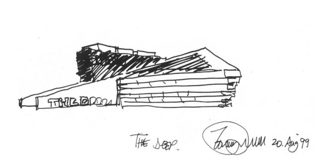 在上个世纪末,The Deep以其独具特色的造型,开创了滨水文化建筑设计的新思路。在更大的城市景观中,动感的造型为平直的河岸在河口交汇处带来聚焦点。建筑形体的隐喻也引发人们对自然形态的联想,硬朗的形体和有机的线条,就像一块被侵蚀的岩石,表皮上不规则的凹陷处,则是建筑出入口和镶嵌其中的窗户。整座建筑的屋顶面与外墙面都是有一定倾斜角度的,因此建筑是作为一个三维物体来呈现,而不是一系列的二维平面。