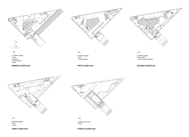 场地所处的河口特殊的滨水景观激发我们从波浪和冰川的形态中获取灵感。The Deep的主建筑体量是位于场地西南尖角的四层高游客中心,容纳着世界级的水族馆展厅。它被设计成彷佛正从深水中浮出水面的戏剧化造型。