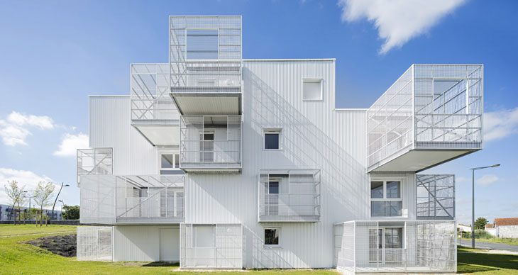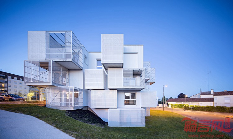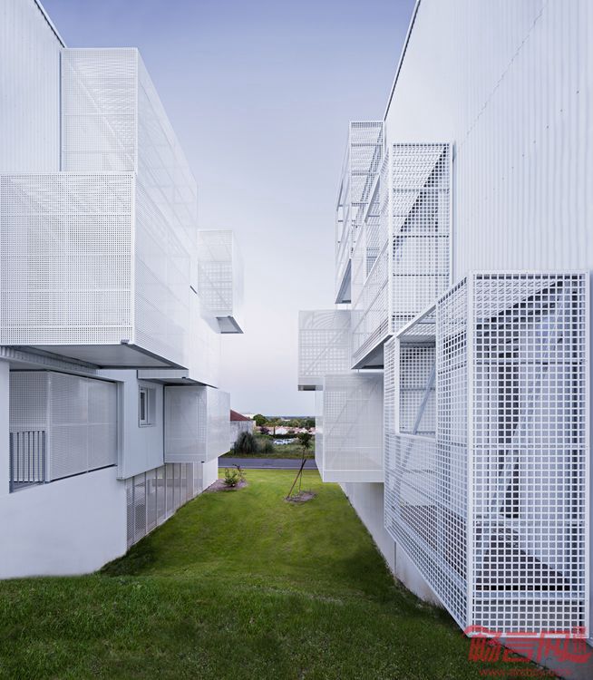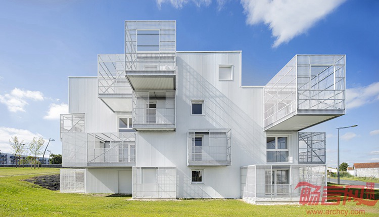 Poggi + More设计了法国Saintes社会住宅。建筑一面带有白色的方形阳台,让其看上去如同一系列堆叠的不规则方体。这个名为白云的项目面积达1886平米,涵盖30套住宅。通过金属格栅阳台的设计,设计师希望达到增添户外空间的目的。