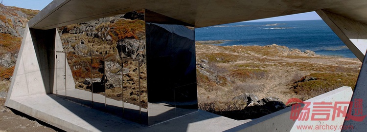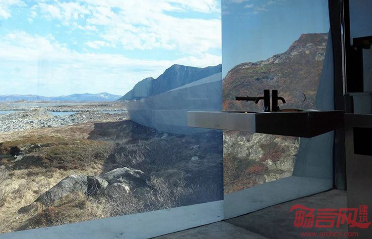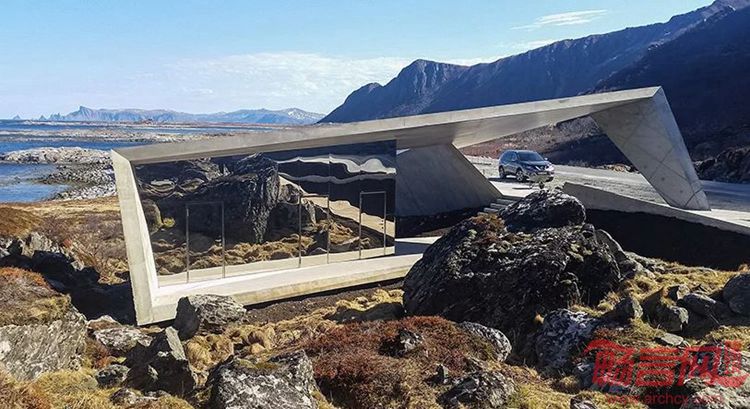 在风光迤逦的海滨景色中,屹立着挪威萨米人神圣的Bukkekjerka岩层构造,历史上,它曾被视作天然的圣坛。萨米人曾经在此进行祭奠仪式,而20世纪中叶起,这里也被当作户外祭拜场地,吸引到此的游客前来参观。挪威公共道路管理局委托Morfeus事务所设计游客休息区,希望建筑能融入所在地理环境。该公共区和卫生间设施已于今年6月7日对外开放。该项目中,卫生间成为最具表现力的部分,与周围锯齿状的山峦相互融合,由围合若干镜面玻璃的折叠的混凝土板组成。