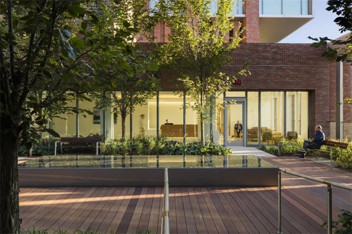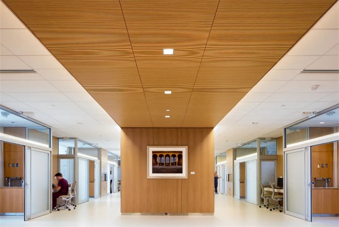 建筑内部采用大量的木质饰面和其它暖色调材料提供令人愉悦的环境,静逸的氛围有助于患者的治疗和恢复,为家属、访客和医护人员营造宁静安心的环境。