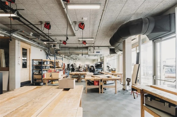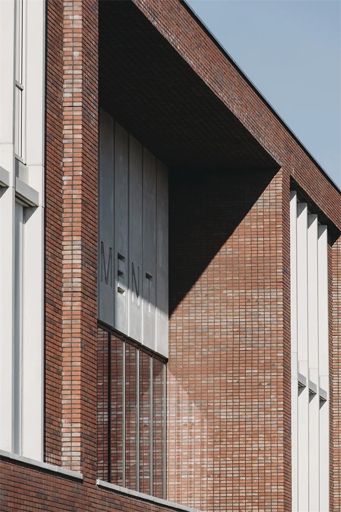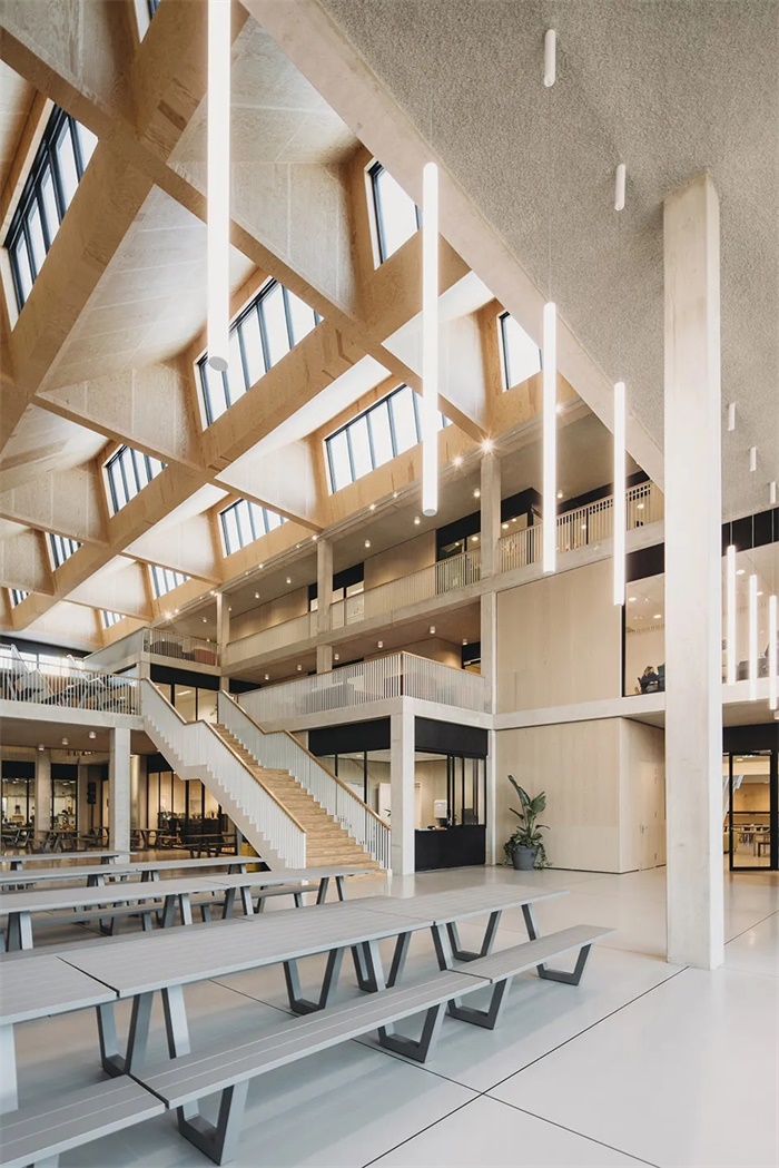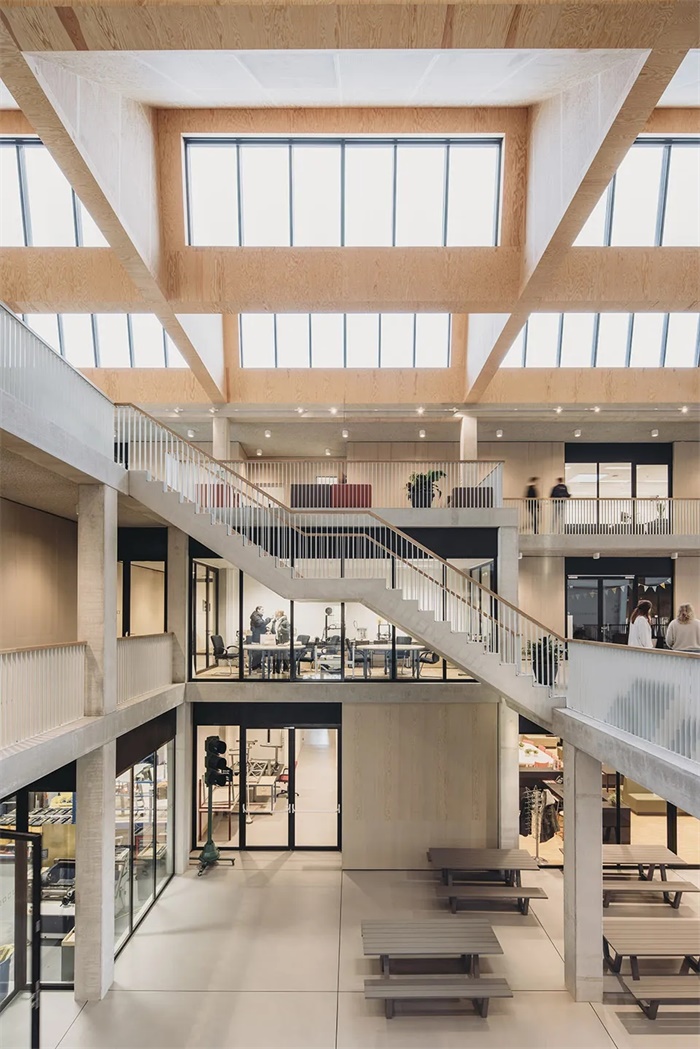 该建筑的设计以通用柱网为基础,为未来的改建提供了灵活性。外墙镶嵌着不同行业的砖块,寓意学校提供的实践教育。内部参考了工业环境,屋顶采用木材装饰,光线从锯齿状的屋顶射入。