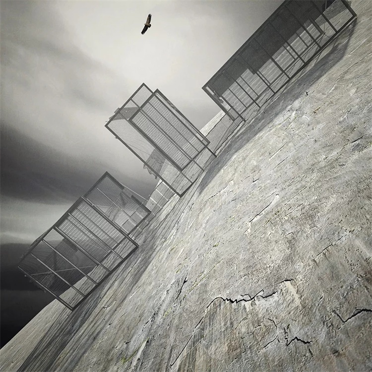 Christophe Benichou设计了法国东南部Verdon峡谷的攀岩者休憩空间。自1960年代起,这一南法峡谷凭借独特的石灰岩材质和深度,成为登山爱好者必去的景点。设计师表示,景色壮观,摄人心魄,悬崖深达700米,成为一个极富挑战的“游乐场”。设计师Christophe Benichou创造了他所说的“Verdon阳台”概念方案。坐落于峡谷高处,悬挂平台为攀爬者提供友好的休息平台。健身人士可以躲避烈日和落石,甚至有提供过夜设施的潜能,为崎岖的自然背景增添了家居般的舒适性。