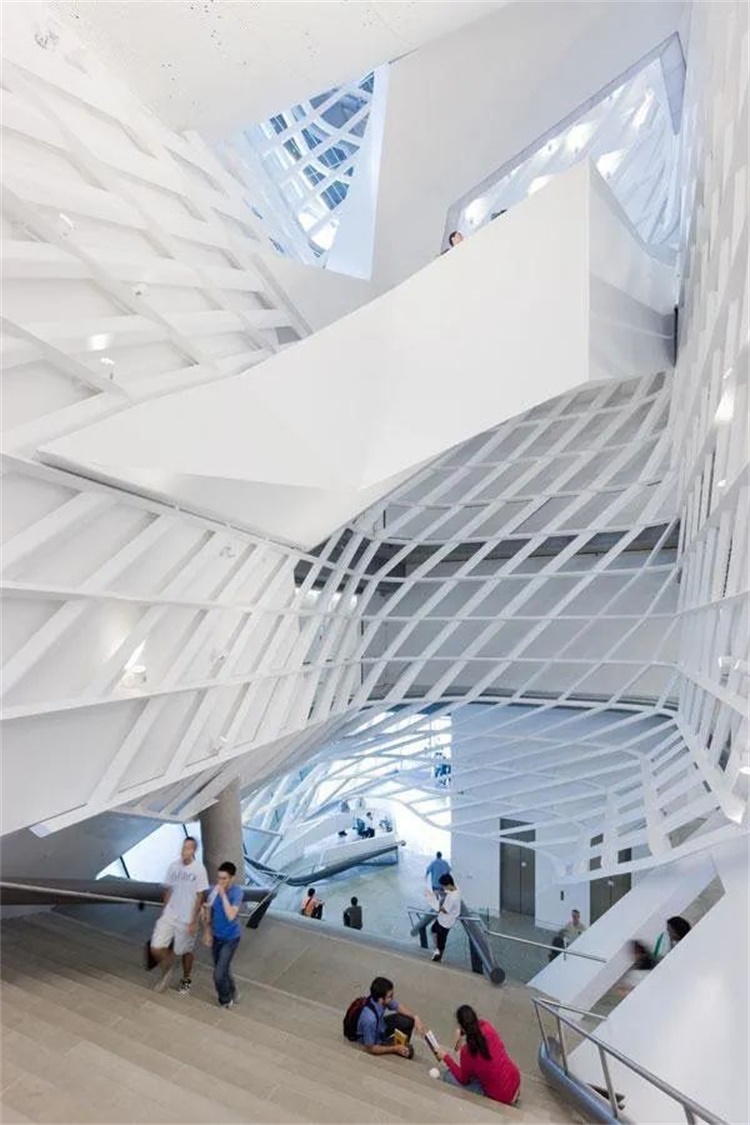 在功能上,它作为建筑的社交中心,提供了一系列非正式社交及知识创意交流的场所,满足了预定会议、即兴会议、学生聚会、讲座及学术性知识辩论等多元的空间需求,并连通了周围的教学空间、公共空间与商业空间。