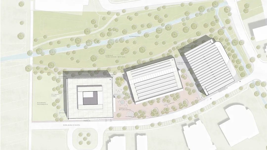 项目位于费尔德施塔特的新大楼由三座紧凑排列的建筑组成,它们将 TÜV 园区包围起来,并沿着 Fleinsbach 地块连成一体。