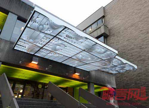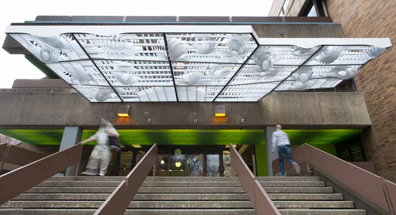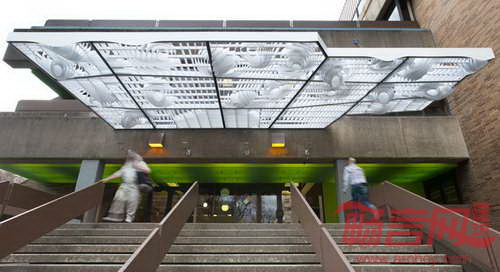 FAULDERS工作室为波特兰州立大学科研中心设计了“Entrium薄云装置”,成为建筑主入口的遮阳结构。这一顶棚设施采用铝型材,方便光线透过,赋予明亮开放的下方空间。